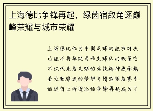 上海德比作为中国足球的经典对决,已经不再单纯是两支球队的较量,它不仅代表着足球的竞技精神,更承载着无数球迷的梦想与情感。随着赛季的进行,上海德比的“争锋再起”成为了绿茵场上一场备受期待的赛事,上海上港与上海申花这两大球队,作为上海足球的代表,代表着不同的球迷群体和足球文化。本文将围绕上海德比的激烈角逐展开,详细探讨绿茵宿敌之间的巅峰荣耀与城市荣耀,分析上海德比对球迷、对城市乃至对中国足球的深远影响。
